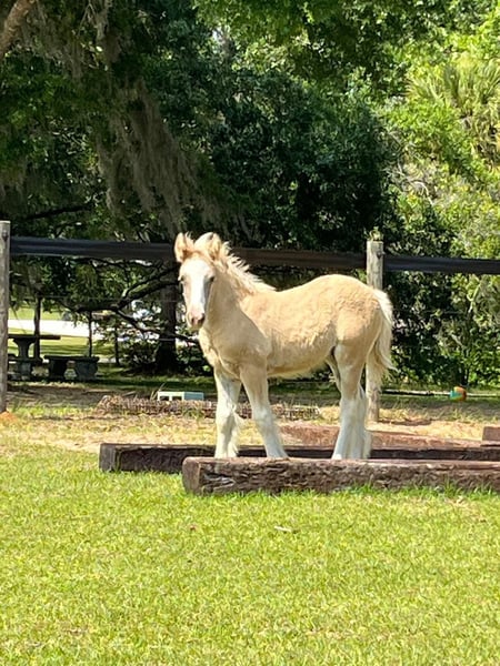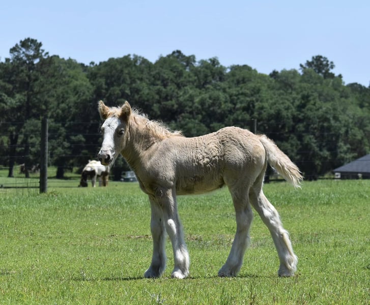 Is a rare Silver Grulla filly born 4/21/25. She is expected to mature well over 15 hands and be as stocky as they get. She should have a proper amount of hair and is show quality. She has been handled since birth and will continue her training until weaned. Payment plan available until weaned at 5-6 months. Her personality is very curious, brave, and LOVES attention. She has amazing conformation and seems to "pose" for the camera.
