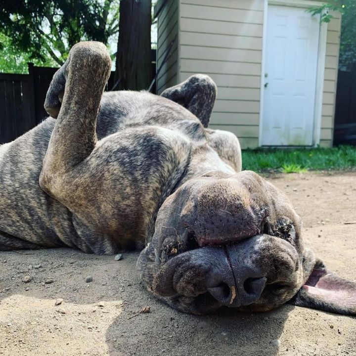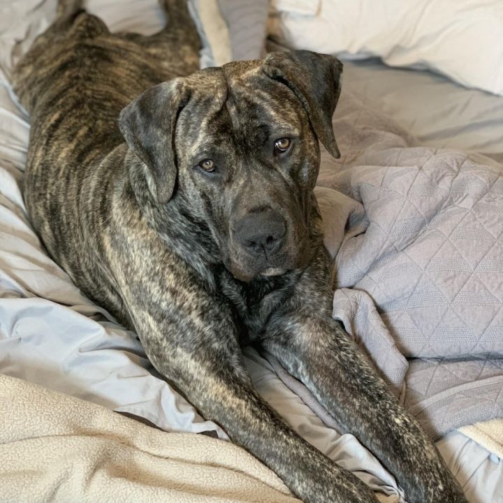 Boogie is a senior, extra‑large Boerboel mix with a brindle coat. He’s around 7 years old and weighs roughly 130 lb. He’s affectionate, protective and deeply devoted — happiest when he’s close to his owner, whether chilling on the couch or lying with you in the yard.