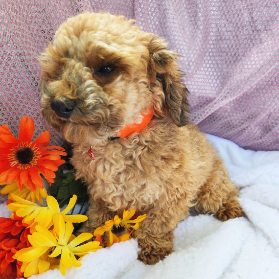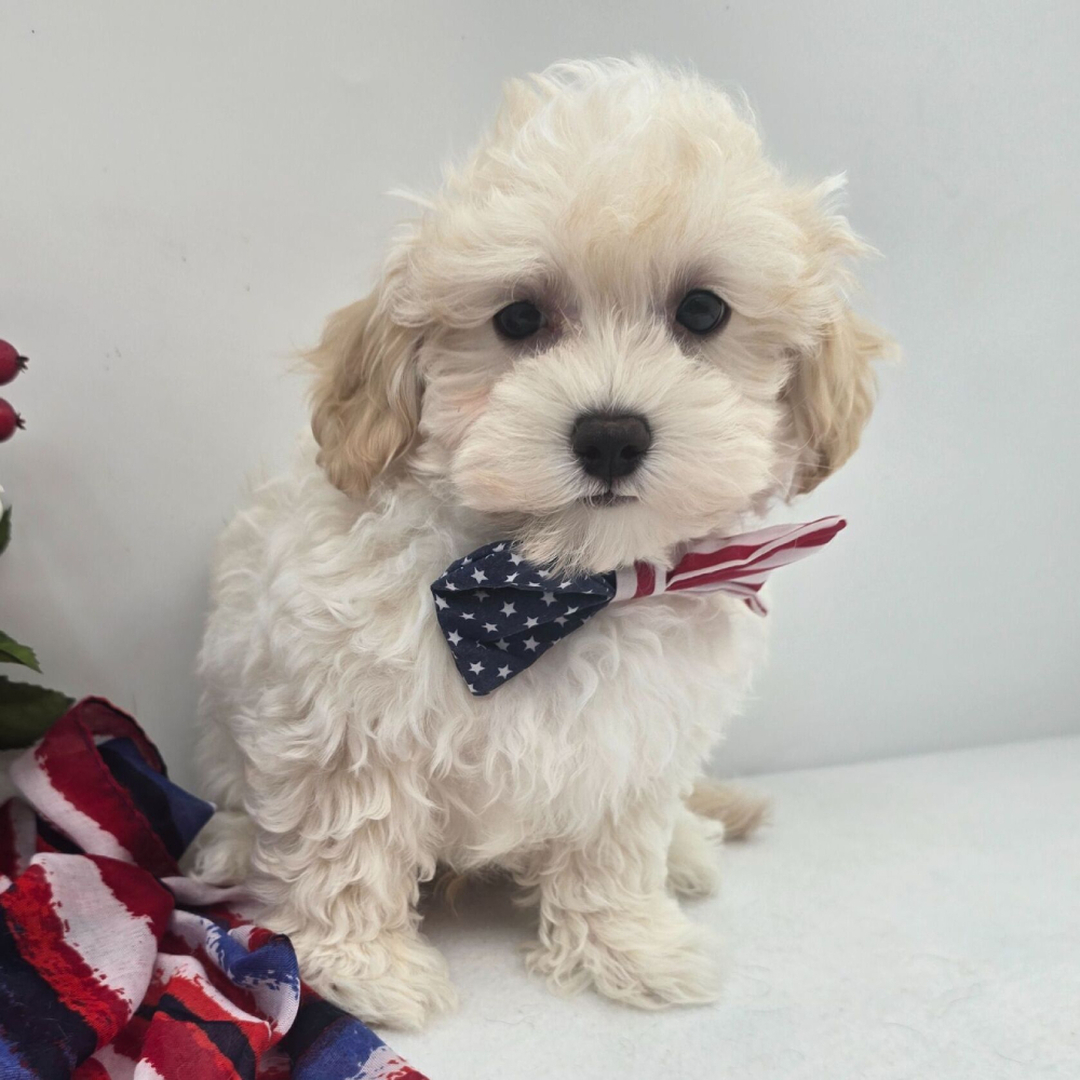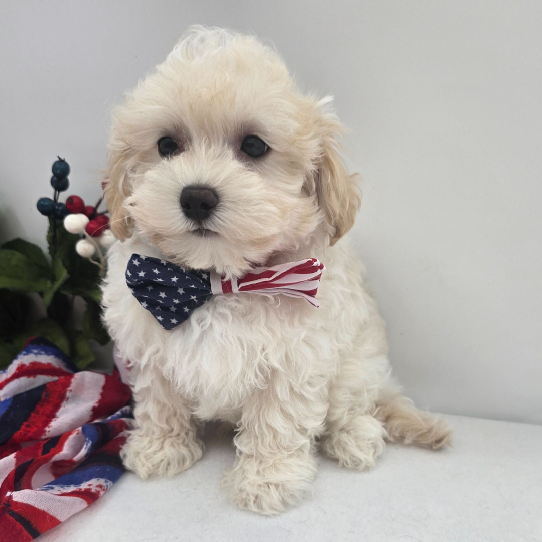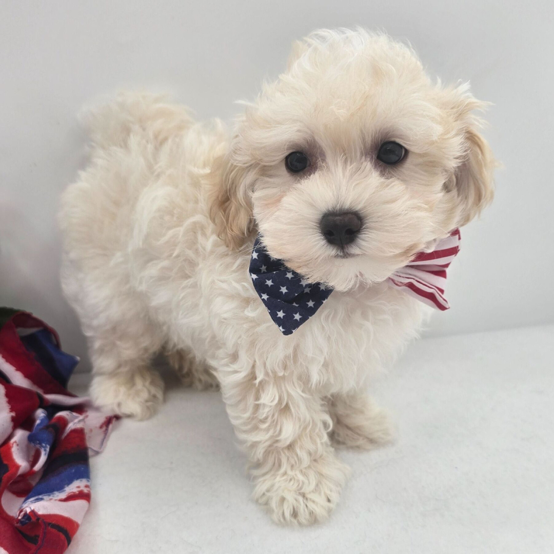 Hi, I'm Boss! I'm a 13-week-old male Maltipoo with a beautiful cream coat, born on April 19, which makes me an Aries pup. I am ready now to plan my trip to my forever family. Once I reach my adult size, I'm expected to weigh between 5–7 lbs. I'm all ready to be your new best friend and bring joy to your days.