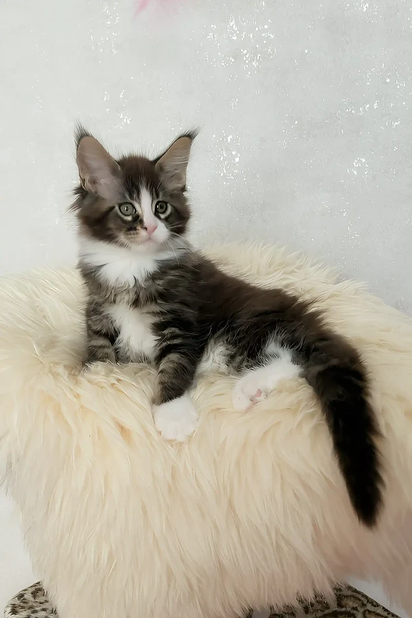 A male Maine coon kitten just 9 weeks old, and I can’t wait to meet you. With my striking black ticked tabby coat accented by crisp white patches, I’m a little work of art wrapped in fur. My big, expressive yellow eyes are always watching, curious and full of wonder, and my whisker pads puff out just enough to give me a soft, distinguished look. I have a sturdy build even at this young age, promising to grow into a large, gentle companion who will weigh between 17-22 lbs when fully grown. My size is matched only by my heart—big, kind, and ready to become your family’s newest friend.