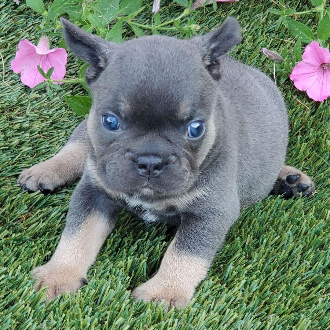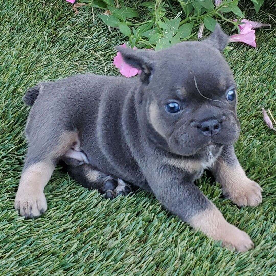 Hi, I'm Eddy! I'm a 6-week-old male French Bulldog with a beautiful blue & tan coat, born on June 11, which makes me a Gemini sign. When I reach my adult size, I should weigh between 20–30 lbs. I'm AKC registered. I will fill your home with love and my wagging tail.