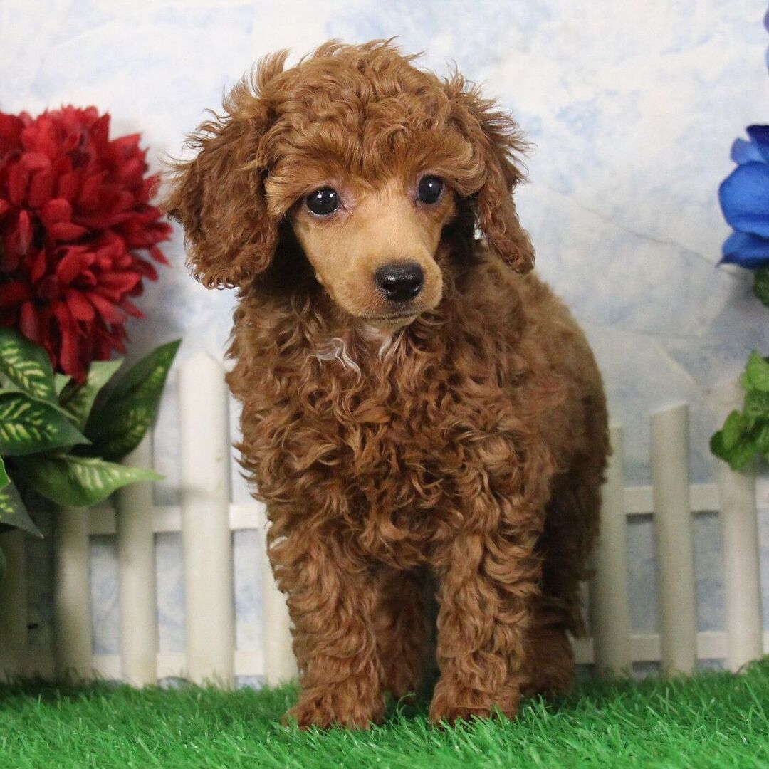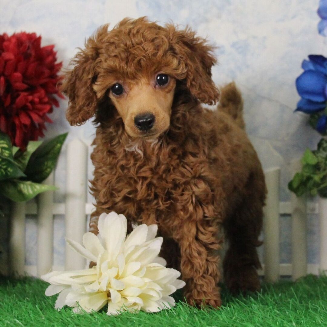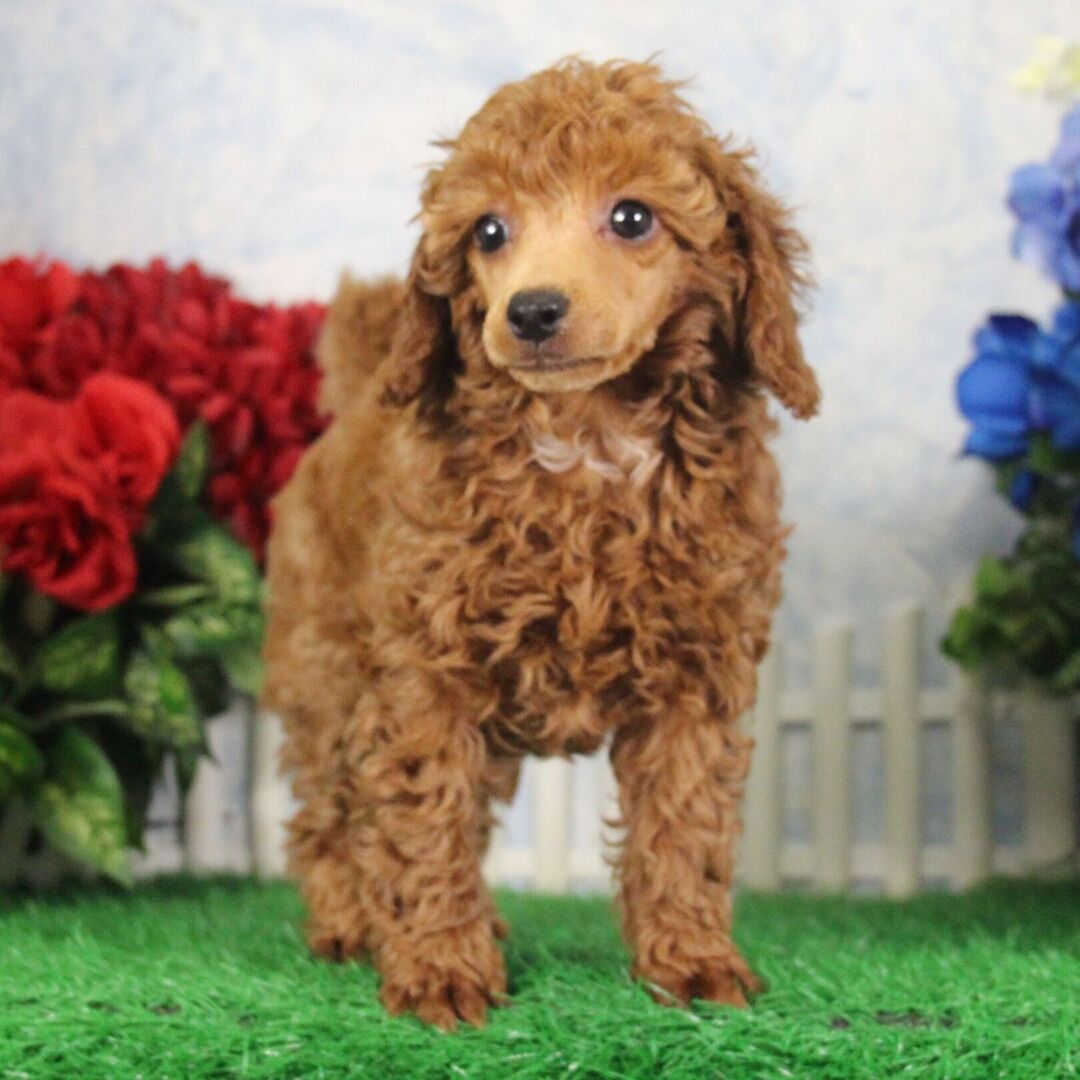 Hi, I'm Emmy! I'm a 9-week-old female Poodle with a beautiful red coat, born on May 22, which makes me a Gemini pup. I am ready now to plan my trip to my forever family. I'm AKC registered. My goal in life is to keep your lap warm and your heart full.