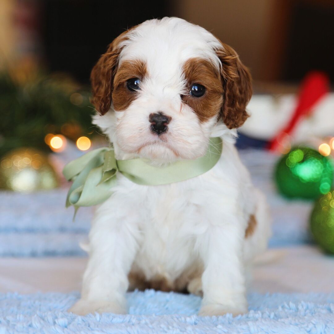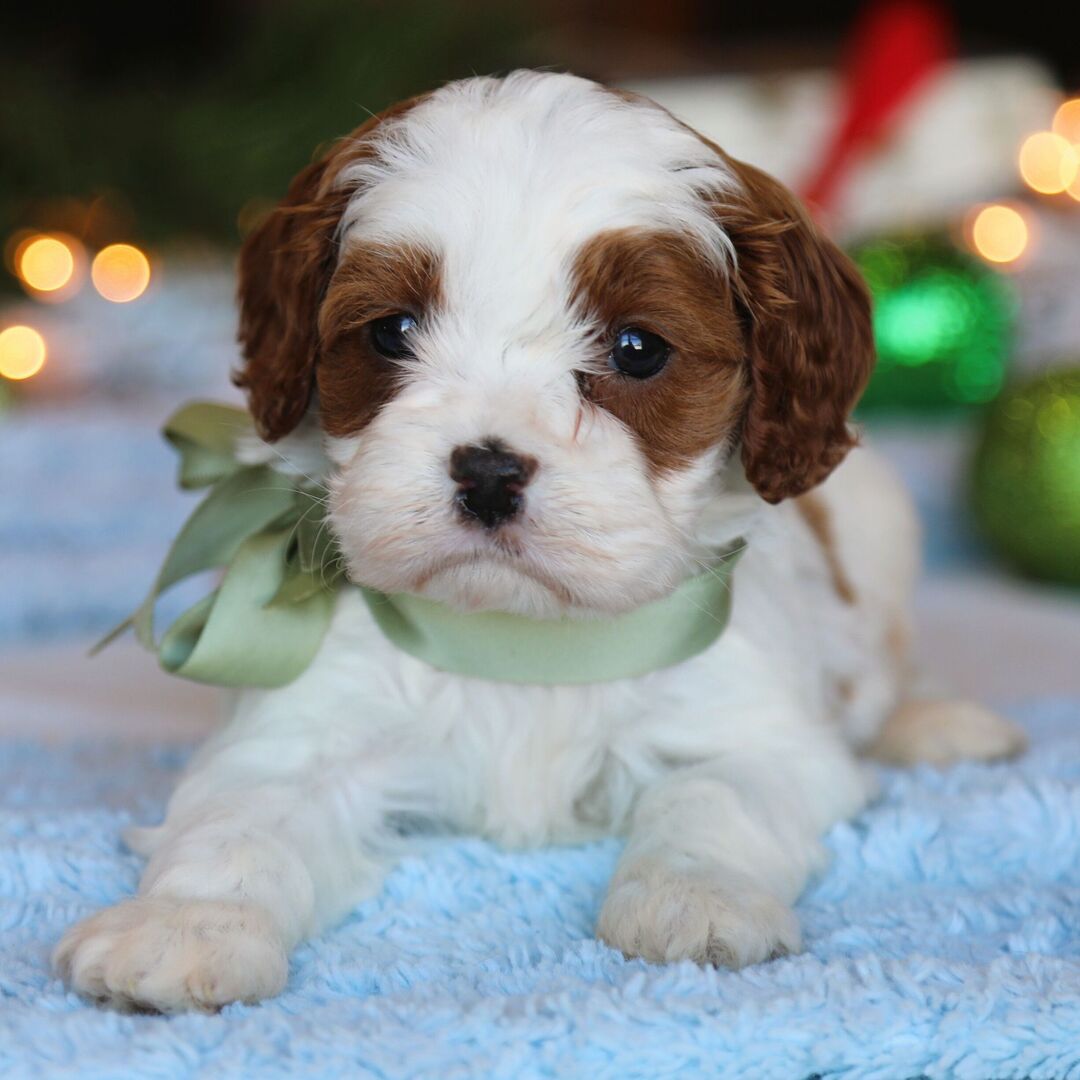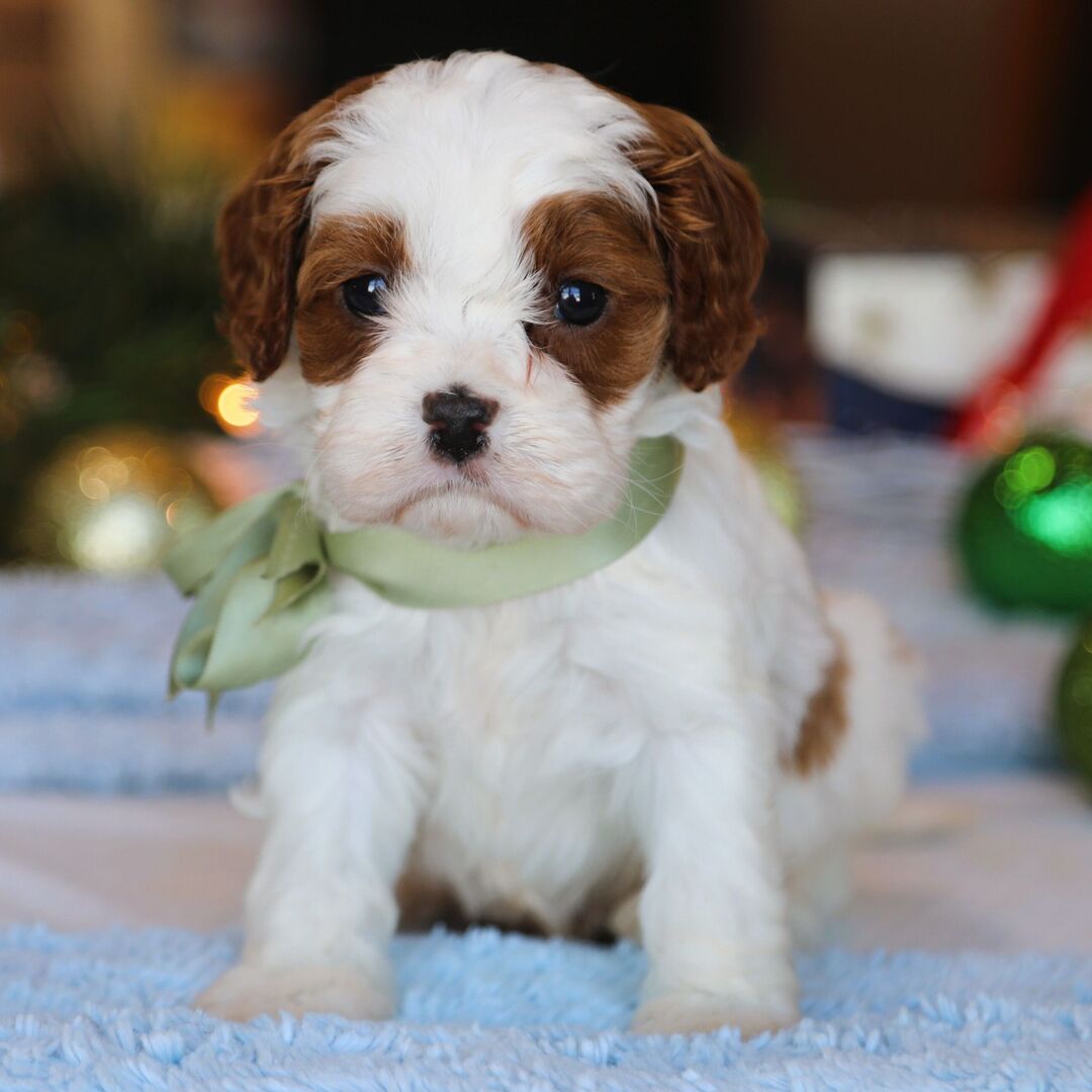 Hi, I'm Everest! I'm a 5-week-old male Cavapoo. My dad is a Poodle and my mom is a Cavalier King Charles Spaniel. I have a beautiful red & white coat, and I was born on October 5, which makes me a Libra sign. I'll be ready to go home to my forever family after November 30, once I'm grown enough to leave my litter. When I reach my adult size, I should weigh between 10–18 lbs. I'm excited to meet my forever family and share my love.