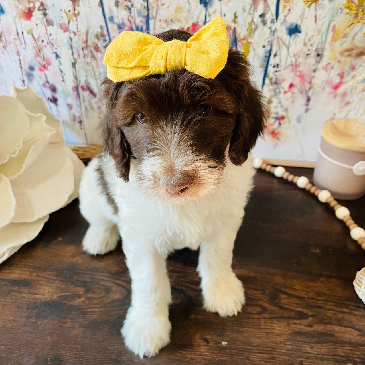I'm a 16-month-old female born on April 19, 40 to 55lbs full grown and will come with a 2 year guarantee, vet checked, microchipped, up to date on vaccines, started on potty training and kennel training and of course, raised with lots of love. All of our puppies are raised in our home and are well socialized with kids, cats and other dogs. Both parents are genetic tested and have OFAs done as well. We will even send them home with one of our awesome go home bags to get your started on your new journey with your sweet pup.