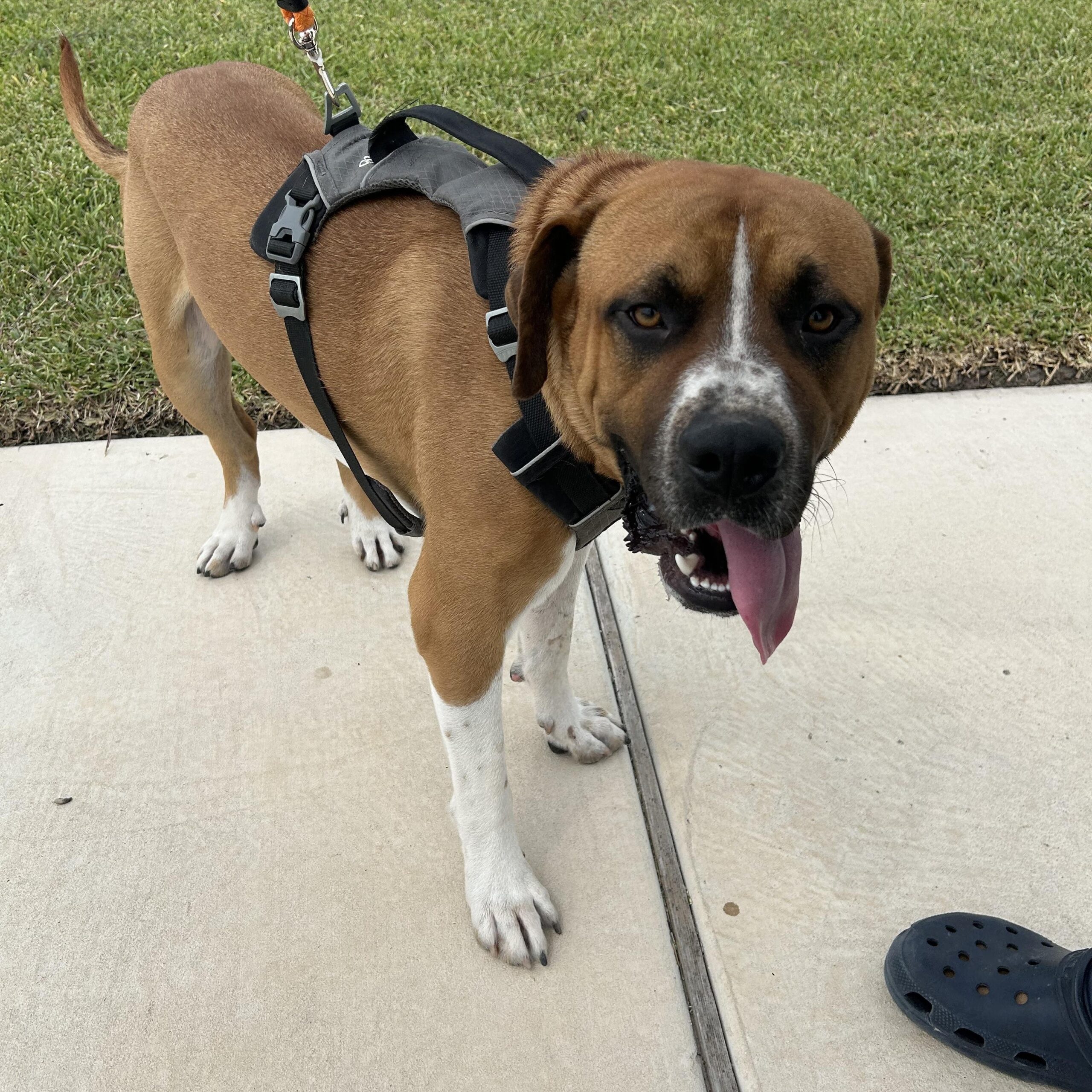 Gordon is a sweet 1-year-old male Boerboel mix with the kind of gentle energy that makes a big dog feel like a cuddly companion. He’s house-trained, good with other dogs and children, and has proven that he can comfortably share space — even with a much smaller pup.