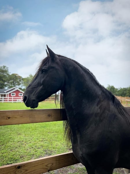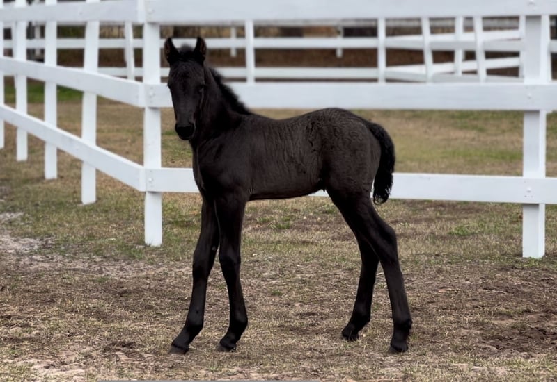 This stunning young Friesian gelding is a picture of elegance and promise. With his jet-black coat, strong build, and proud carriage, he embodies the classic baroque style Friesians are known for. Though still a foal, his graceful movement and gentle temperament hint at a future filled with presence and power. A true warmblood treasure in the making—ideal for baroque disciplines and lovers of majestic equine beauty.