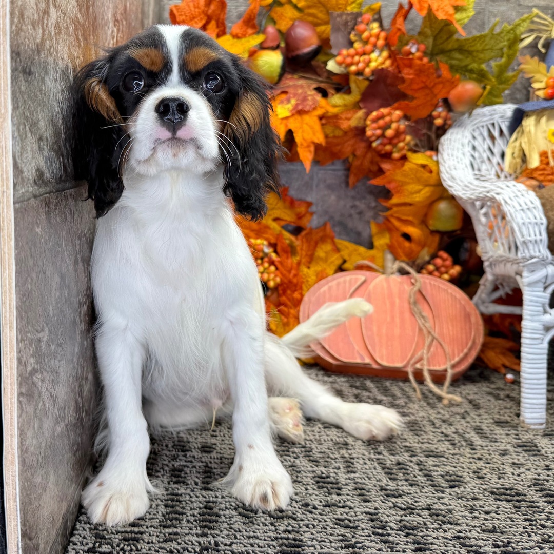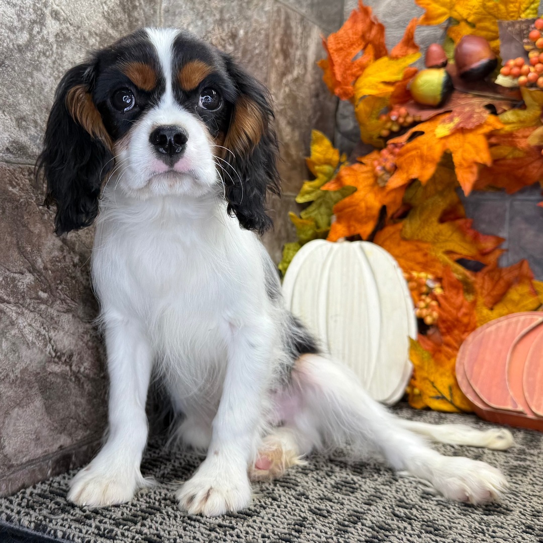 I'm an 18-week-old male Cavalier King Charles Spaniel with a beautiful black & white coat, born on July 7, which makes me a Cancer pup. I am ready now to plan my trip to my forever family. Once I reach my adult size, I'm expected to weigh between 8–23 lbs. I'm AKC registered. I'm ready to be your loyal companion through thick and thin.