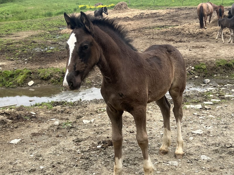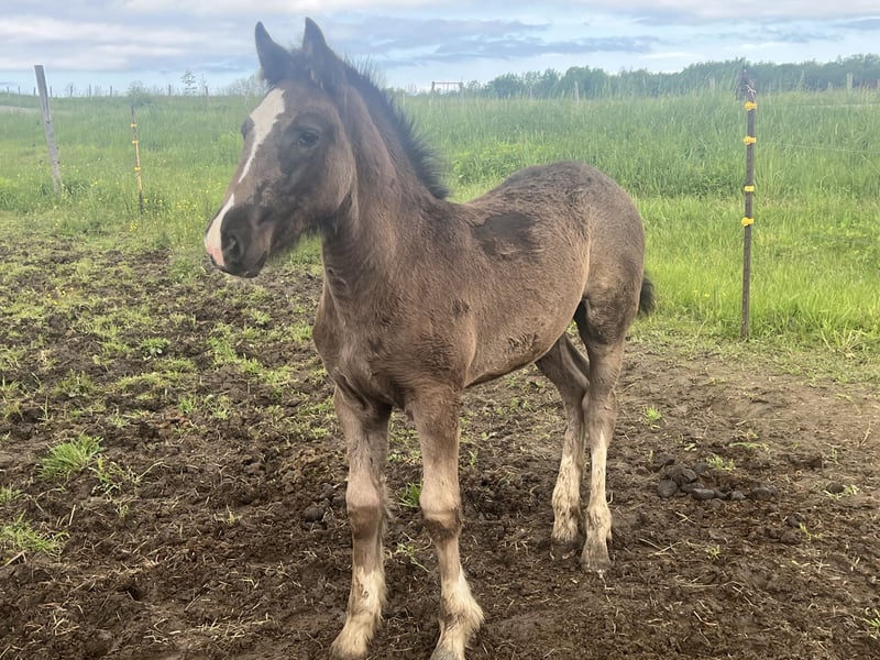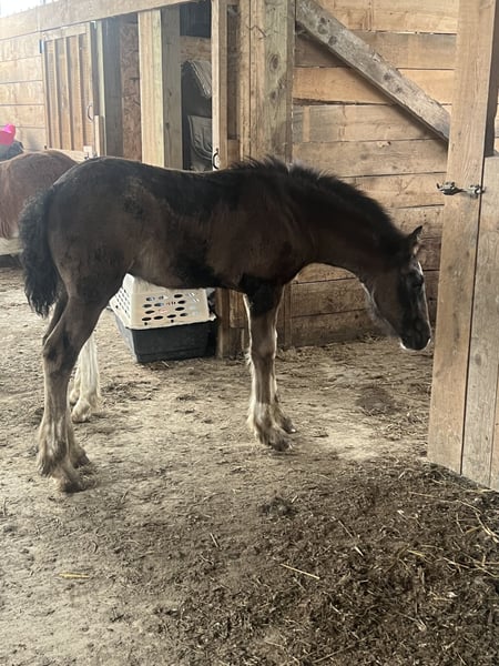 This big beautiful girl is out of a Paint/Fresian mare by my reg Clydesdale stallion. Attached is registration papers for the APHA dam and Reg Fresian parents of the mare, and the papers for the Clydesdale sire. This girl was born thick, and is growing beautifully. She is black with four whites and a blaze, and I have a half sibling here that matches her but you’re looking for a team. I expect this girl to mature about 16hh, she will be heavy enough for bigger riders, and athletic enough to handle rigorous trails, will also be super fancy in carriage! Lots of potential, imprinted at birth, super clean in a stall (her mommas taught her right!) and respectful of fences. Get her at weaning, and start her your way.