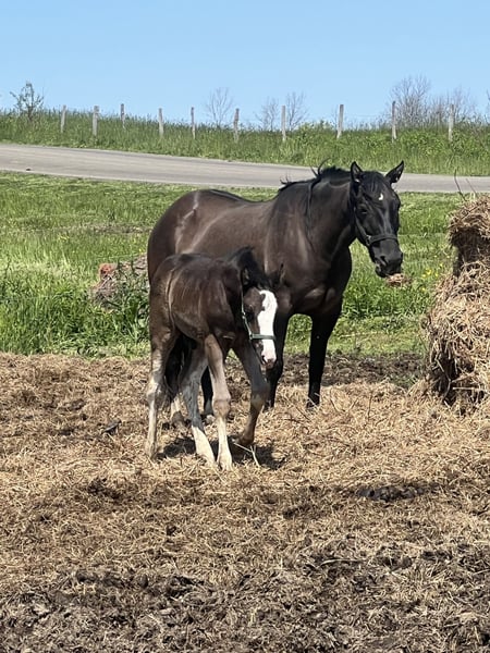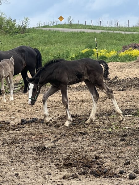 flashy black cokt with four whites and a big white blaze, this boy I expect to mature around 16 hands and be stocky built. Was imprinted at birth, and has been handled regularly and started on halter training. Growing nicely into and really filling out. This boy will be a fantastic all around horse, athletic enough to carry riders on trails, heavy enough to handle ranch work and bigger riders! Will look sharp in a carriage ( Also available is a half sister that matches him!)