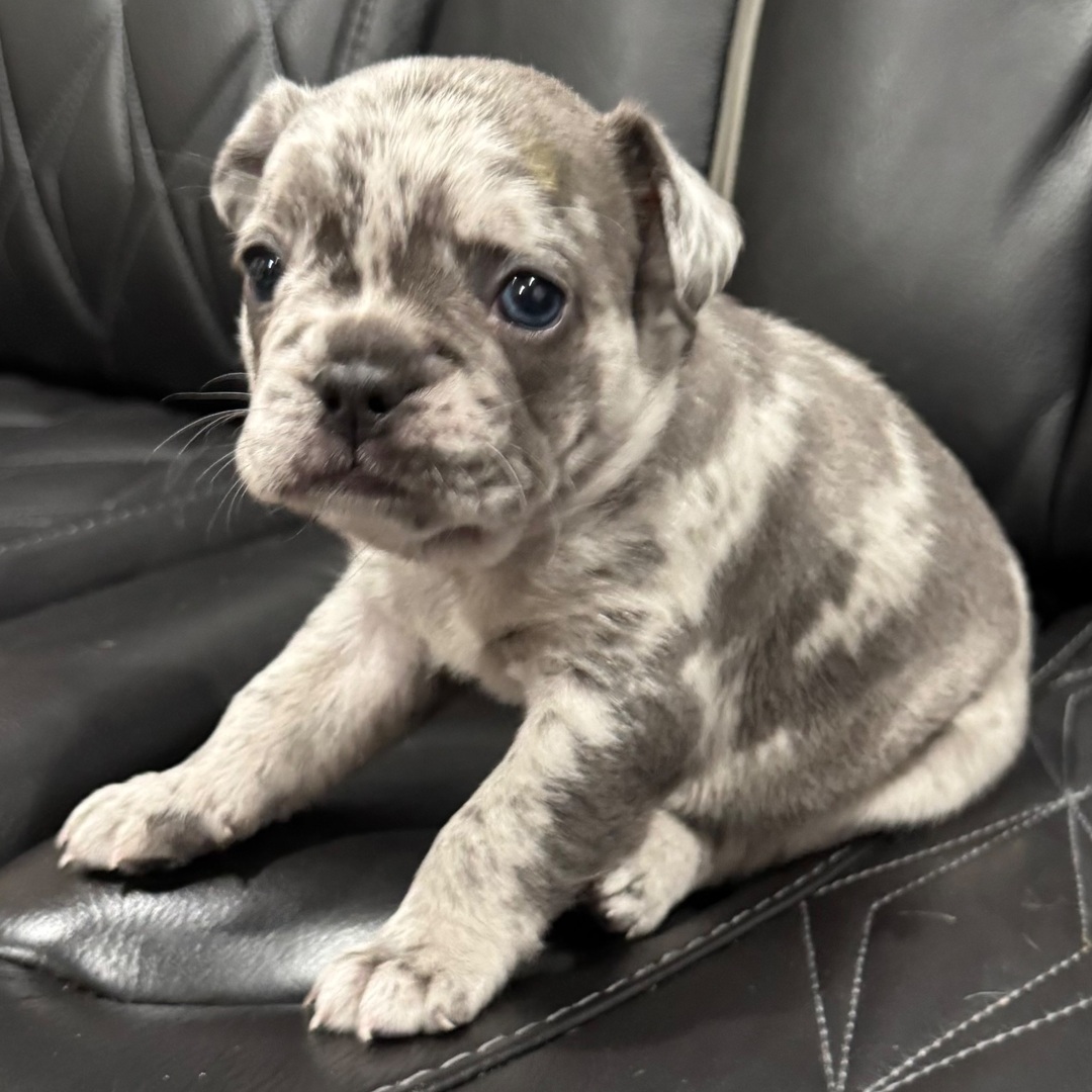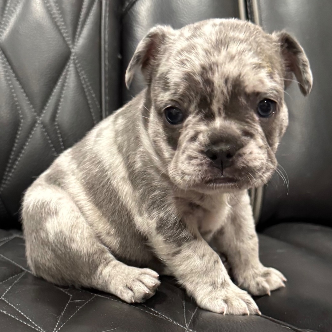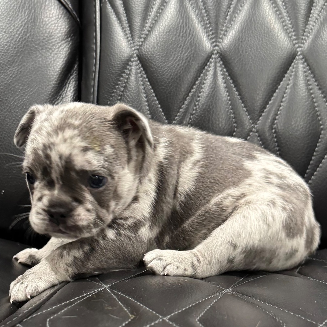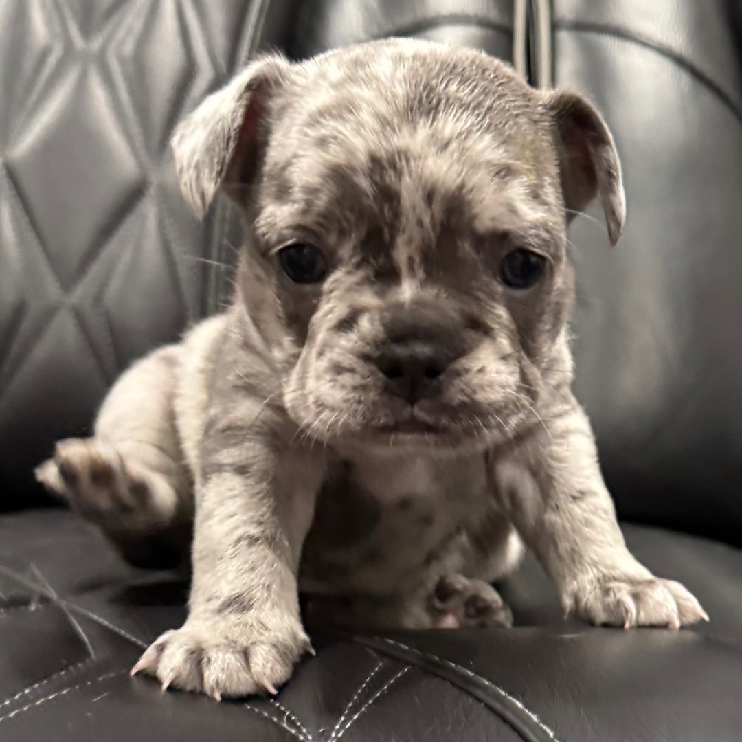 Hi, I'm Paisley! I'm a 5-week-old female French Bulldog with a beautiful merle coat, born on June 15, which makes me a Gemini sign. When I reach my adult size, I should weigh between 20–25 lbs. I'm AKC registered. I'll bring the love, you bring the treats.
