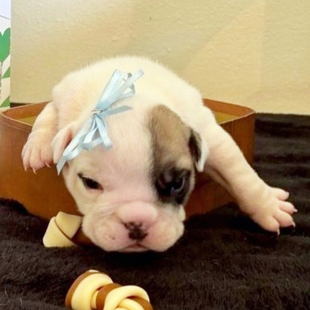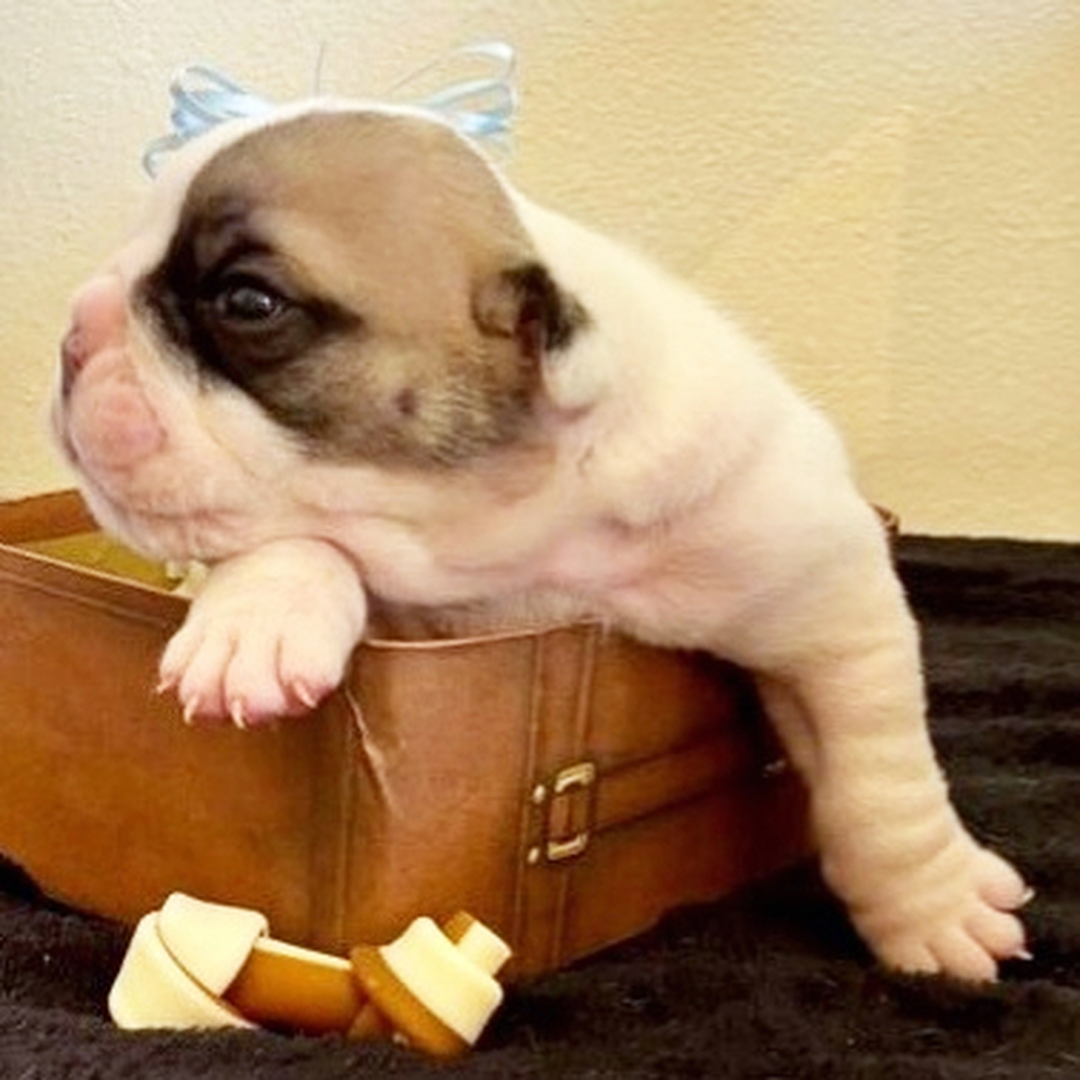 Hi, I'm Pirate Jack! I'm a 2-week-old male Bulldog with a beautiful brindle & white coat, born on July 4, which makes me a Cancer sign. I'll be ready to go home to my forever family after September 4, once I'm grown enough to leave my litter. When I reach my adult size, I should weigh between 40–55 lbs. I'm AKC registered. My happy paws can't wait to dance through your home.