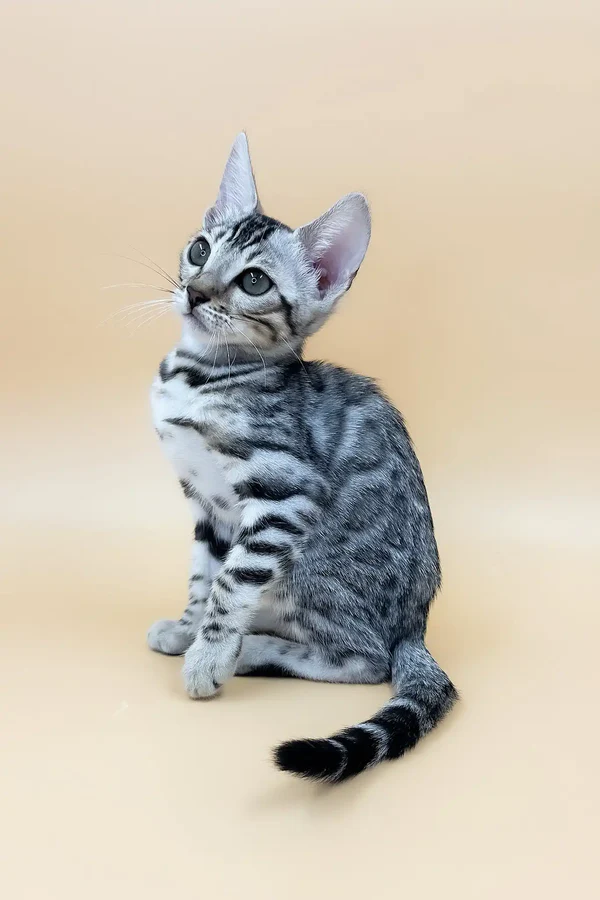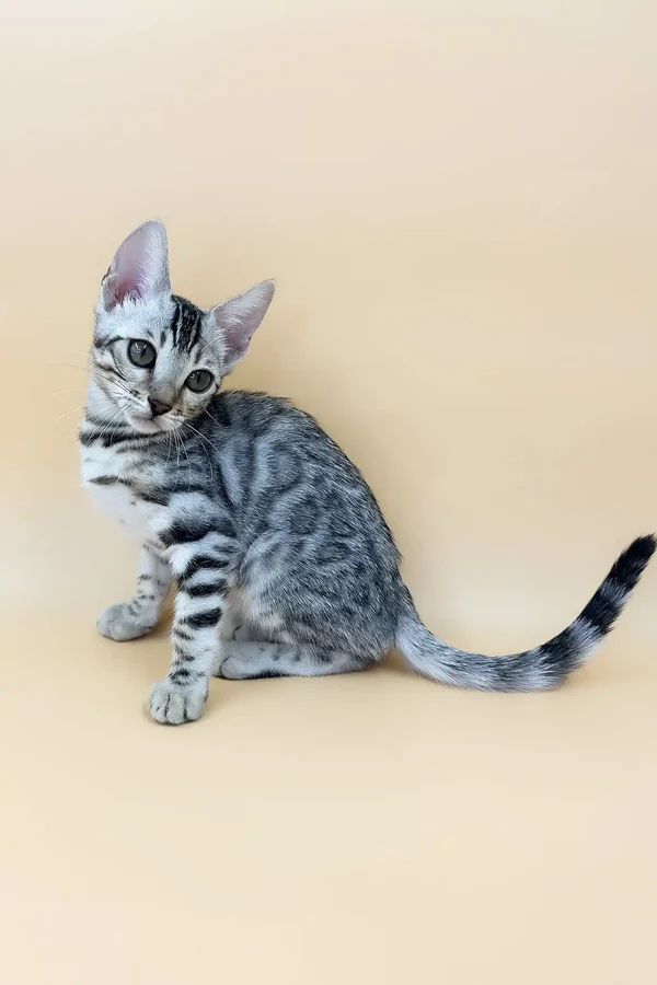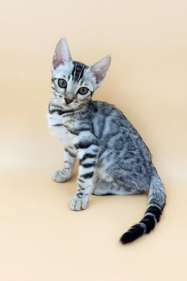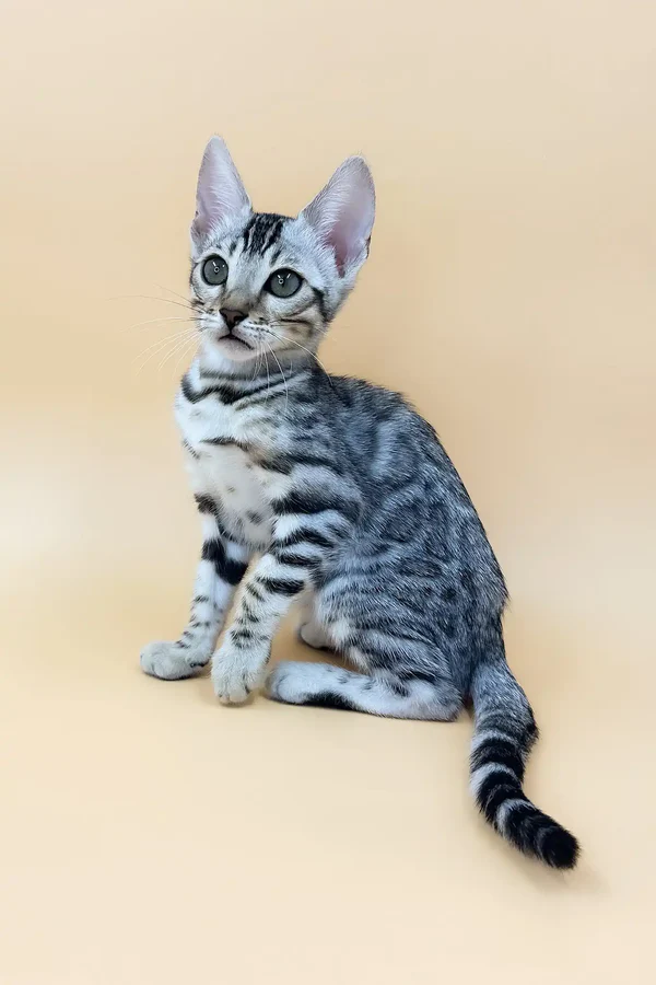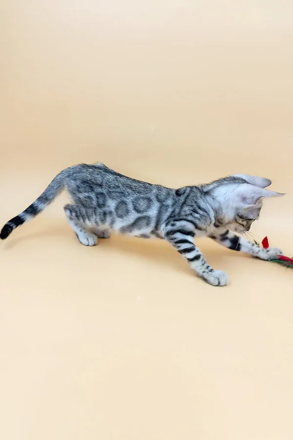 I’m Samantha, a stunning female Bengal kitten with a sleek black silver spotted tabby coat and captivating green eyes that will steal your heart the moment we meet. At just 8 weeks old, I already carry the rare bloodlines and impeccable breed type that make me truly special. My short, silky coat feels as smooth as it looks, and my athletic build with strong hind legs means I’m built for playful adventures and graceful leaps. I’m exotic, lively, and low-allergen—perfect for someone who wants both beauty and personality wrapped up in one extraordinary companion.
