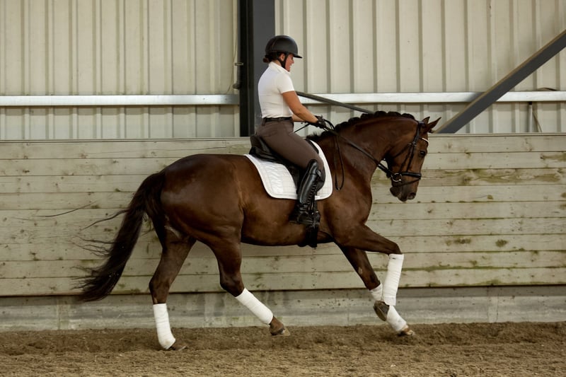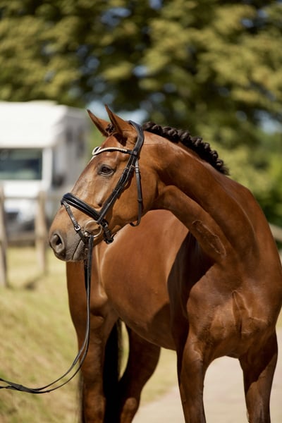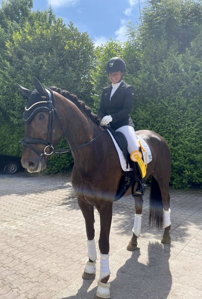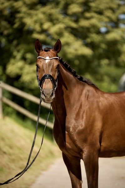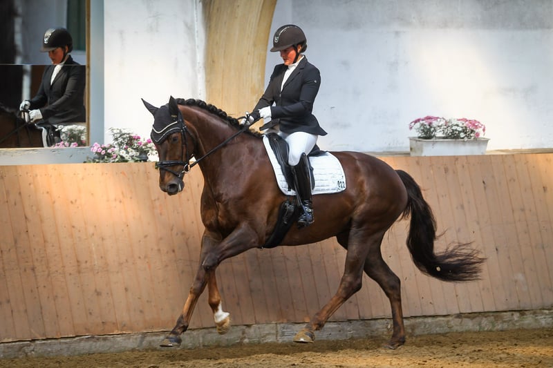 Seraphina is a captivating 6-year-old dark chestnut mare who effortlessly combines elegance, athleticism, and reliability. With consistent placings and victories in Dressage Horse classes A and L — achieving outstanding scores up to 8.4 — she is a promising contender for sport. Her expressive trot, ground-covering walk, and uphill canter make her a delight to ride and an asset in the arena.