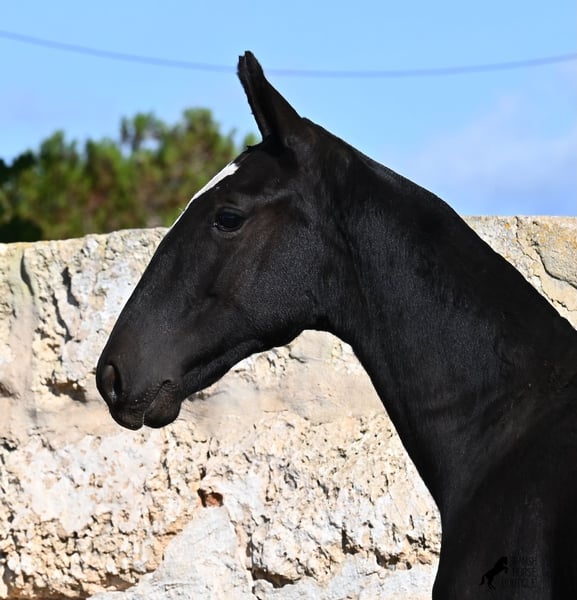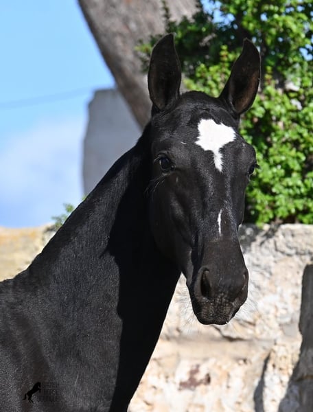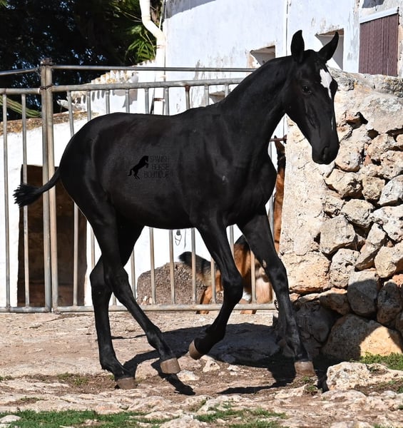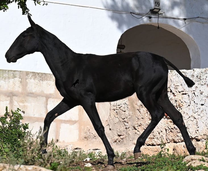 Solis is a striking and noble Menorquín filly with a refined baroque build and classic black colouring — exactly what the breed is known for. As a young foal, she already shows good balance, graceful proportions, and a calm, curious temperament. Her movement is smooth and rhythmic, indicating excellent potential for both dressage and Working Equitation.