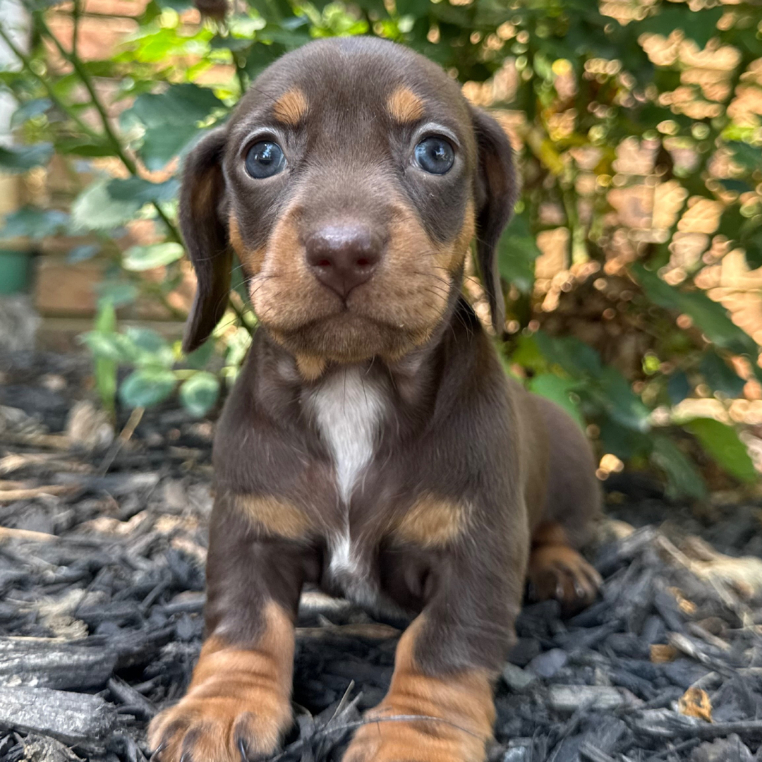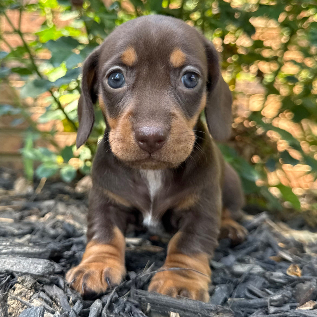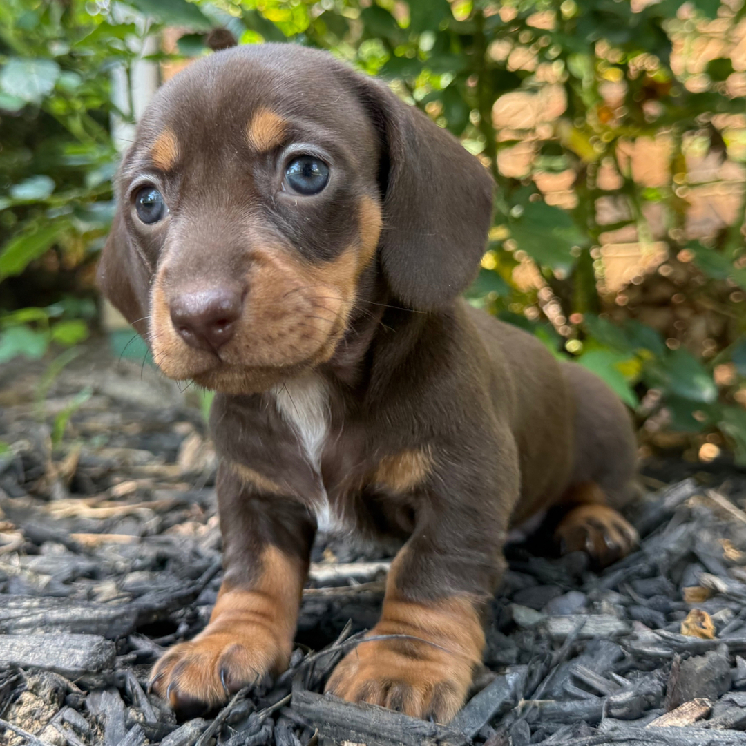 Hi, I'm Sophia! I'm a 5-week-old female Dachshund with a beautiful chocolate & tan coat, born on May 30, which makes me a Gemini sign. I'll be ready to go home to my forever family after July 25, once I'm grown enough to leave my litter. I'm ACA registered. I love to run and roll around outside. But, my favorite thing to do after a long day at play is to snuggle up on the couch next to my family and sleep as they pet my head.