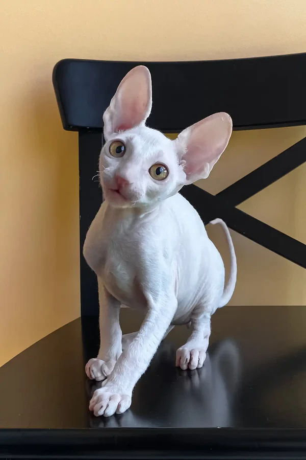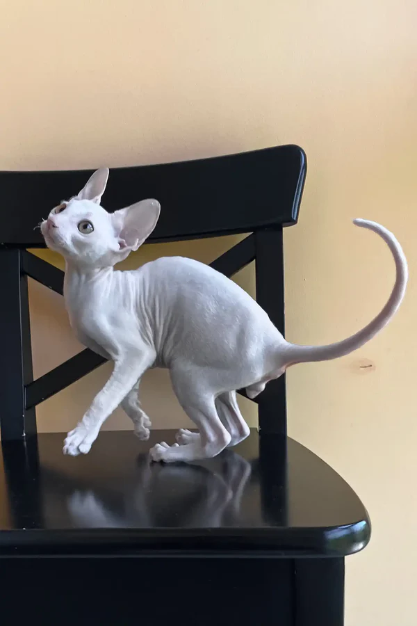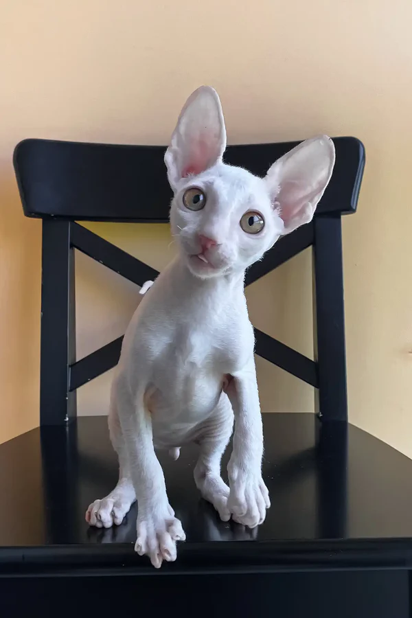Hello, I’m Tuman, a lively 3 months old male Cornish rex kitten with a pristine white wavy coat that feels like soft wool but never sheds, making me a perfect companion for those who appreciate cleanliness without sacrificing cuddles. My bright yellow eyes are full of curiosity and sparkle with mischief, reflecting the playful spirit inside me. I’m not just any kitten—I come from rare bloodlines and embody the best traits of the cornish rex breed: intelligence, agility, and a heart that’s eager to connect. I’m ready to bring excitement and warmth into your life, becoming the joyful friend you never knew you needed.