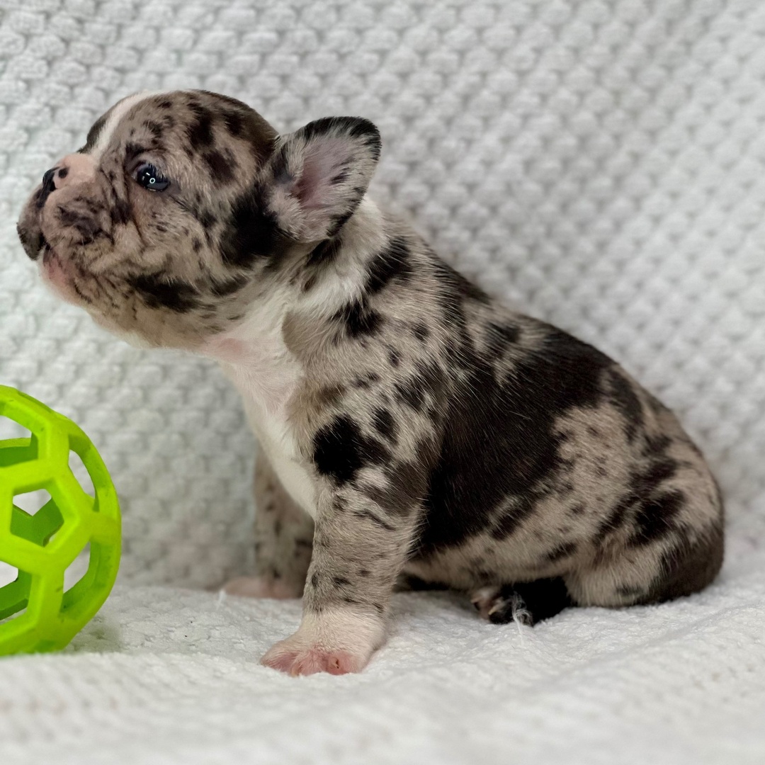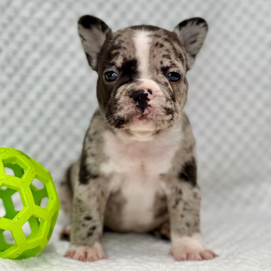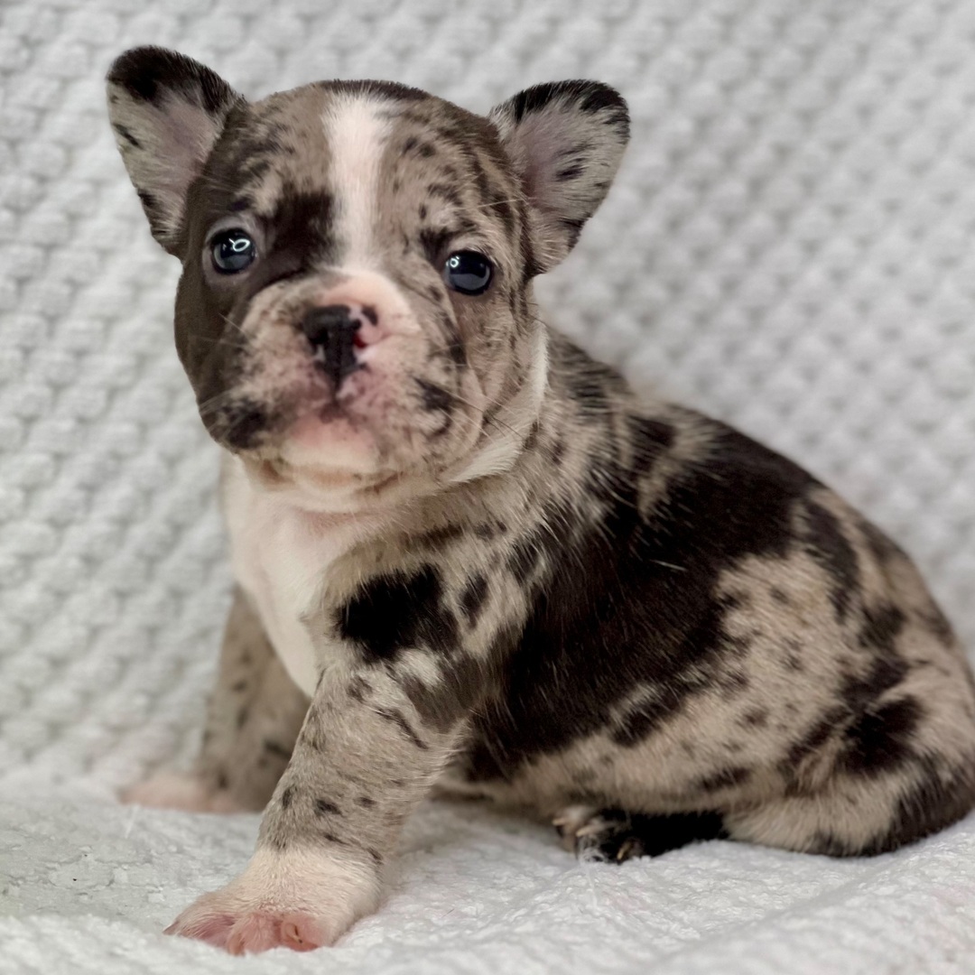 Hi, I'm Wendy! I'm a 4-week-old female French Bulldog with a beautiful merle coat, born on June 25, which makes me a Cancer sign. I'll be ready to go home to my forever family after August 20, once I'm grown enough to leave my litter. When I reach my adult size, I should weigh between 20–22 lbs. I'm AKC registered. I'm ready to bring my fluffy love and puppy kisses into your life.